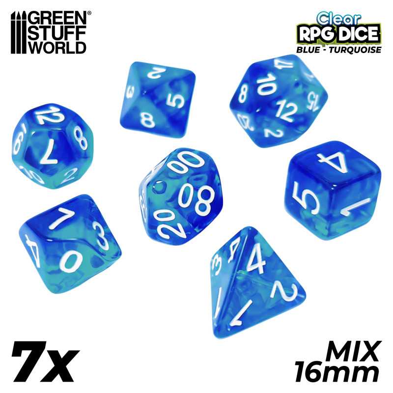 7x Mix 16mm Dice - Clear Blue/Turquoise