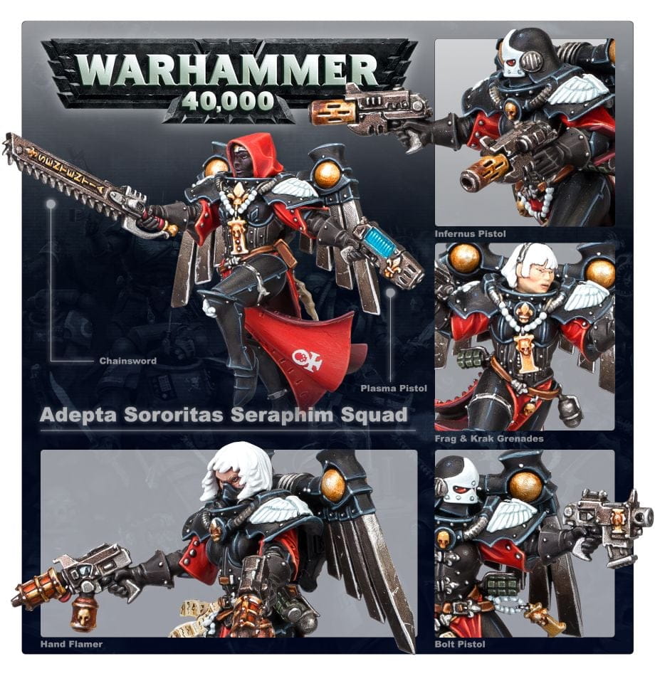 Anielscy wojownicy znani jako Serafini walczą w zaawansowanej straży armii Adepta Sororitas. Wyposażeni w skoki w stylu San Leor, schodzą z wysoka i rzucają się na linie wroga, używając szoku i podziwu, by rozbić formacje, zanim ich siostry otworzą ogień. Każdy Serafin dzierży parę pistoletów, wybranych spośród świętej trójcy broni. Pistolety ryglowe służą do plucia gradami śmierci, gdy Serafini lecą po niebie, miotacze ognia plują płonącymi potokami, by podpalić sfory wrogów, podczas gdy pistolety piekielne wystrzeliwują skupione wiązki ciepła, które z pogardliwą łatwością topią się przez zbroje i ciała.