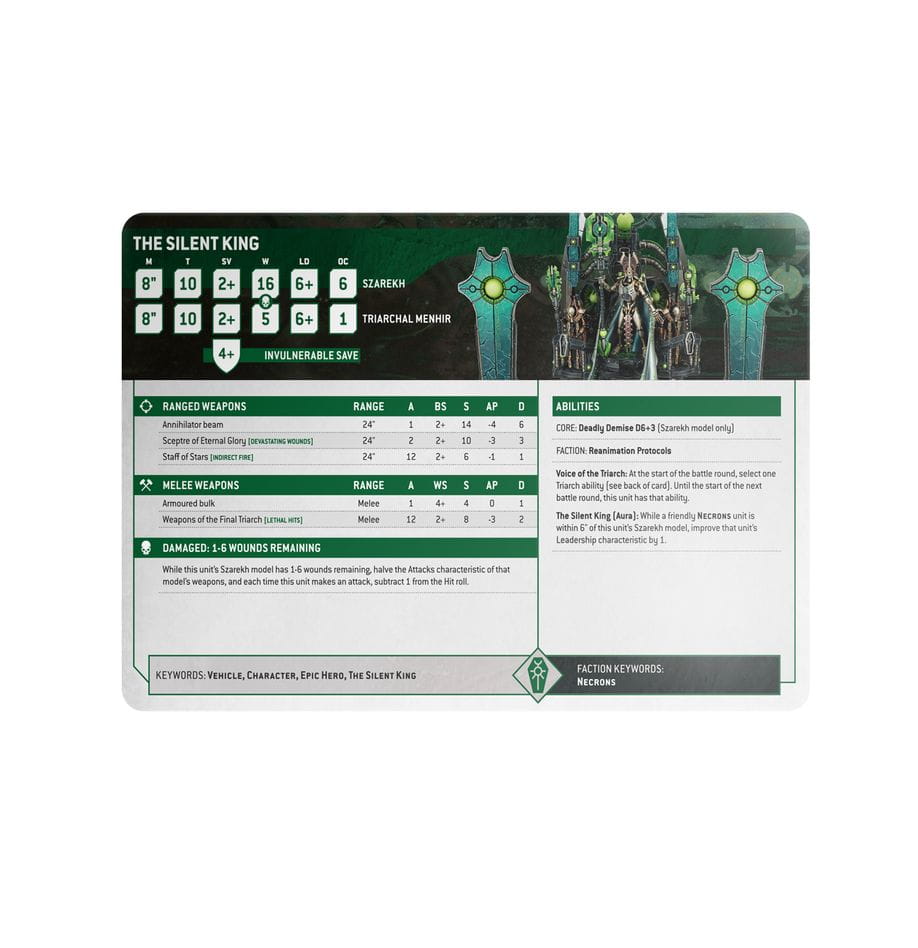 Ten zestaw 53 kart pomoże ci śledzić swoje legiony w grze, z indywidualnymi arkuszami danych dla każdej jednostki Nekronów, szczegółowo opisującymi ich profile, wyposażenie bojowe, opcje i specjalne zdolności. Znajdziesz także kartę referencyjną z zasadami armii Nekronów, a także specjalne karty arkuszy danych do wykorzystania w grach Combat Patrol.