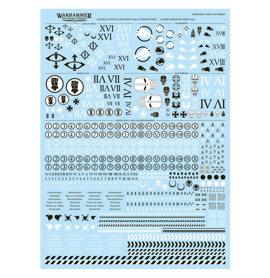 Zestaw jest dostarczany z 1 arkuszem transferowym superciężkiego pojazdu Legiones Astartes, zawierającym 718 wysokiej jakości transferów wodnych do dekoracji miniatur. Zawiera ikonografię Legionu dla Synów Horusa, Imperialnych Pięści, Żelaznych Wojowników i Salamandry, a także ogólne oznaczenia pojazdów i eskadr, cyfry, wieńce laurowe i pasy zagrożenia.
